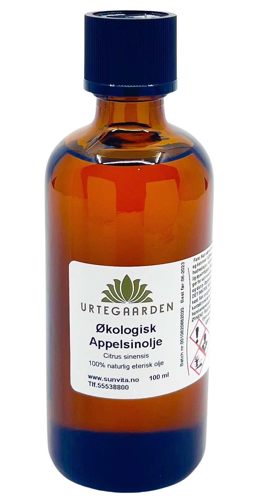 Kosmetikk: Virker antiseptisk, regenererende og sammentrekkende. Velegnet til fet og moden hud. Dosering: Max 1%. Må aldri anvendes ufortynnet. NB!Virker fotosensibilisende. Duft: Søt, varm citrus, toppnote. Dosering: Følg anvisninger i oppskriften.Fremstillt ved kaldpressing av skall fra økologisk Citrus sinensis. Inneholder følgende av de 26 stoffer: Limonen, linalool og citral. INCI: Citrus Aurantium Dulcis Oil.