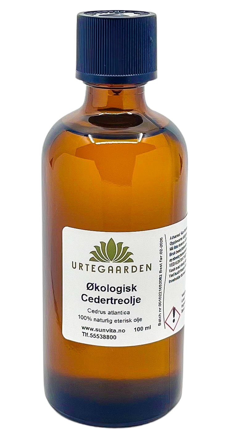 Anvendelse: Kosmetikk. Virker antiseptisk, sammentrekkende og lindrende. Velegnet til sensitiv, uren og fetet hud. Dosering: Max 1%. Må aldri anvendes ufortynnet. Duft Bunnnote. Fremstillt ved vanndampdestillering av ved fra Cedrus atlantica. Kun til utvortes bruk. INCI: Cedrus Atlantica Oil Produktet er i sin rene form faremerket: