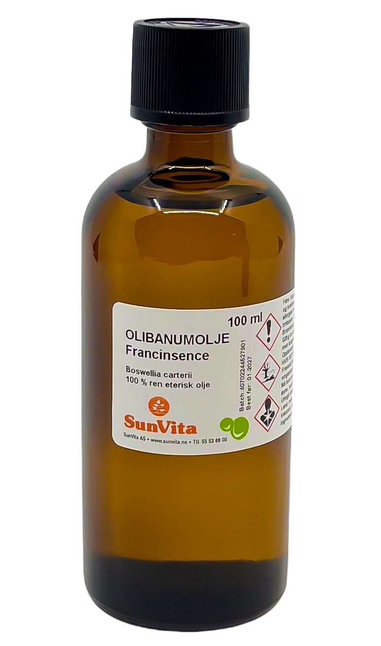 Anvendelse: Kosmetikk. Virker stimulerende på cellefornyelsen, forebygger blodsprengninger. Velegnet til moden og sensitiv hud. Dosering: Max 1%. Må aldri anvendes ufortynnet. Duft: Bunnote. Fremstillt ved vanndampdestillering av harpiks fra Boswellia sp. Kun til utvortes bruk. Inneholder følgende av de 26 stoffer: Limonen og linalool. INCI: Boswellia carterii gum oil