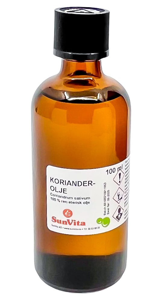 Korianderfrø, eterisk olje har en varm, krydret og lett søtlig aroma med hint av sitrus. Det er en allsidig olje som har mange bruksområder. Den er en populær smakstilsetning i mat. Den har en rekke medisinske fordeler og er kjent for å ha anti-inflammatoriske, antibakterielle og soppdrepende egenskaper. Den brukes også i aromaterapi, da den  er kjent for sine beroligende og harmoniserende egenskaper. Næringsmiddelkvalitet. INCI: Coriandrum sativum.
