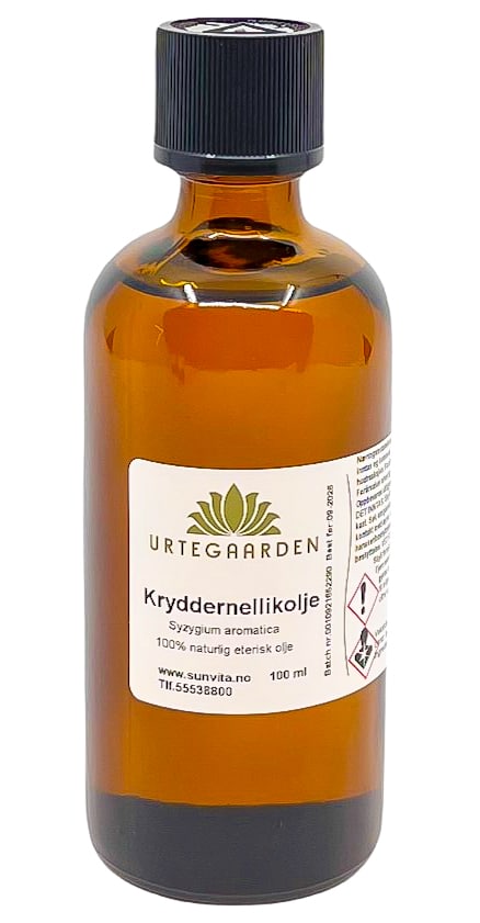 Anvendelse: Kosmetikk og næringsmidler som smaksgiver. Dosering: Følg anvisninger i oppskriften. Må aldri inntas ufortynnet. Kosmetikk: Virker antiseptisk, stimulerende og kløestillende. Velegnet til alle hudtyper. Dosering: Max 1%. Må aldri anvendes ufortynnet. Duft: Mellomnote. Fremstillt ved vanndampdestillering av blomsterknopper fra Syzygium aromaticum L. Næringsmiddelkvalitet. Inneholder følgende av de 26 stoffer: Eugenol. INCI: Eugenia Caryophyllus Oil