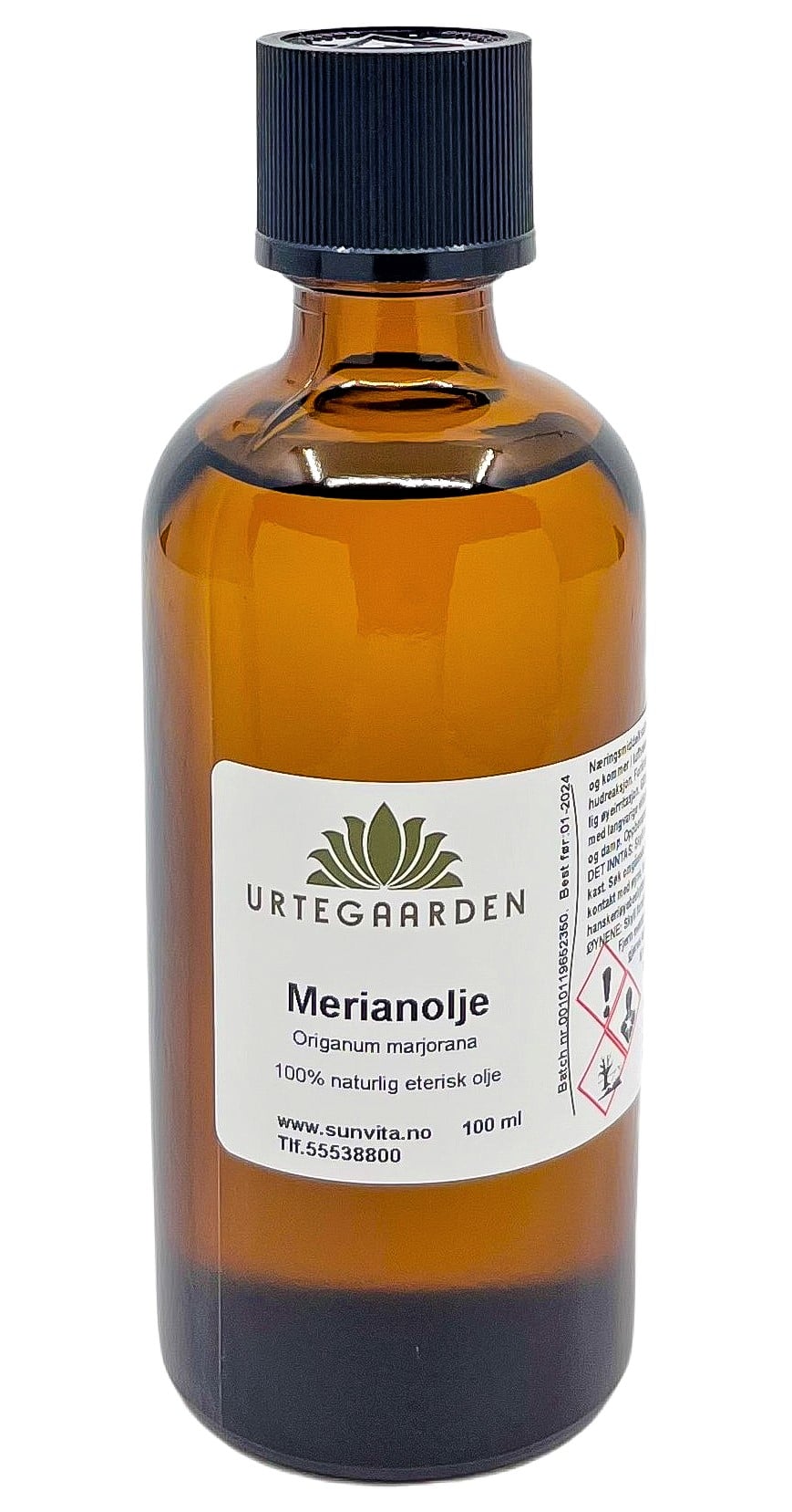 Anvendelse: Kosmetikk og næringsmidler som smaksgiver. Dosering: Følg anvisninger i oppskrift. Må aldri inntas ufortynnet. Kosmetikk: Virker antiseptisk og varmende. Velegnet til alle hudtyper. Dosering: Max 1%. Må aldri anvendes ufortynnet. Duft: Mellomnote. Fremstillt ved vanndampdestillering av blad fra Origanum majorana. Næringsmiddelkvalitet. Inneholder følgende av de 26 stoffer: Linalool og limonen. INCI: Origanum Majorana Oil