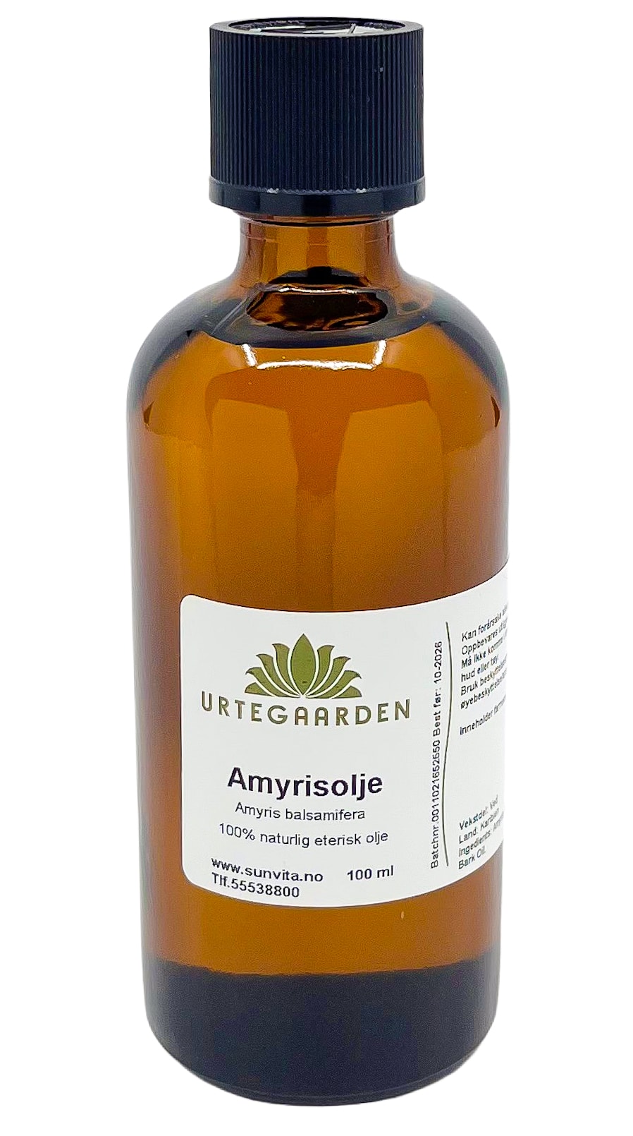Anvendelse: Brukes i ansikts-og kroppspleieprodukter. Virker antiseptisk, stimulerer blodsirkulasjonen og virker beroligende/anti stress. Velegnet til tørr, moden og sensitiv hud. Dosering: Max 1%. Må aldri anvendes ufortynnet. Duft: Bundnote. Fremstilt ved vanndampdestillering av rot og ved fra Amyris balsamifera. Kalles også vestindisk sandeltreolje. Kun til utvortes bruk. Inneholder følgende av de 26 stoffer: Farnesol. INCI: Amyris Balsamifera Bark Oil