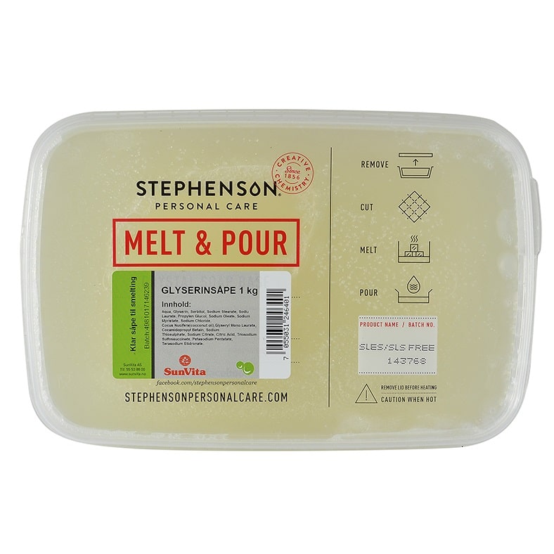 Klar glyserinsåpe, «smelt og hell opp såpe». Lag dine egne såper. Tilsett bare farge og duft.