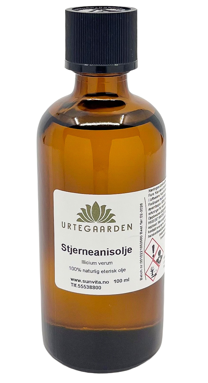 Anvendelse: Næringsmidler som smaksgiver. Dosering: Følg anvisninger i oppskrift. Må aldri inntas ufortynnet. Duft: Mellomnote. Fremstillt ved vanndampdestillering av blad fra Illicium verum. Næringsmiddelkvalitet. Inneholder følgende afvde 26 stoffer: Limonen og linalool. INCI: Illicium Verum Oil
