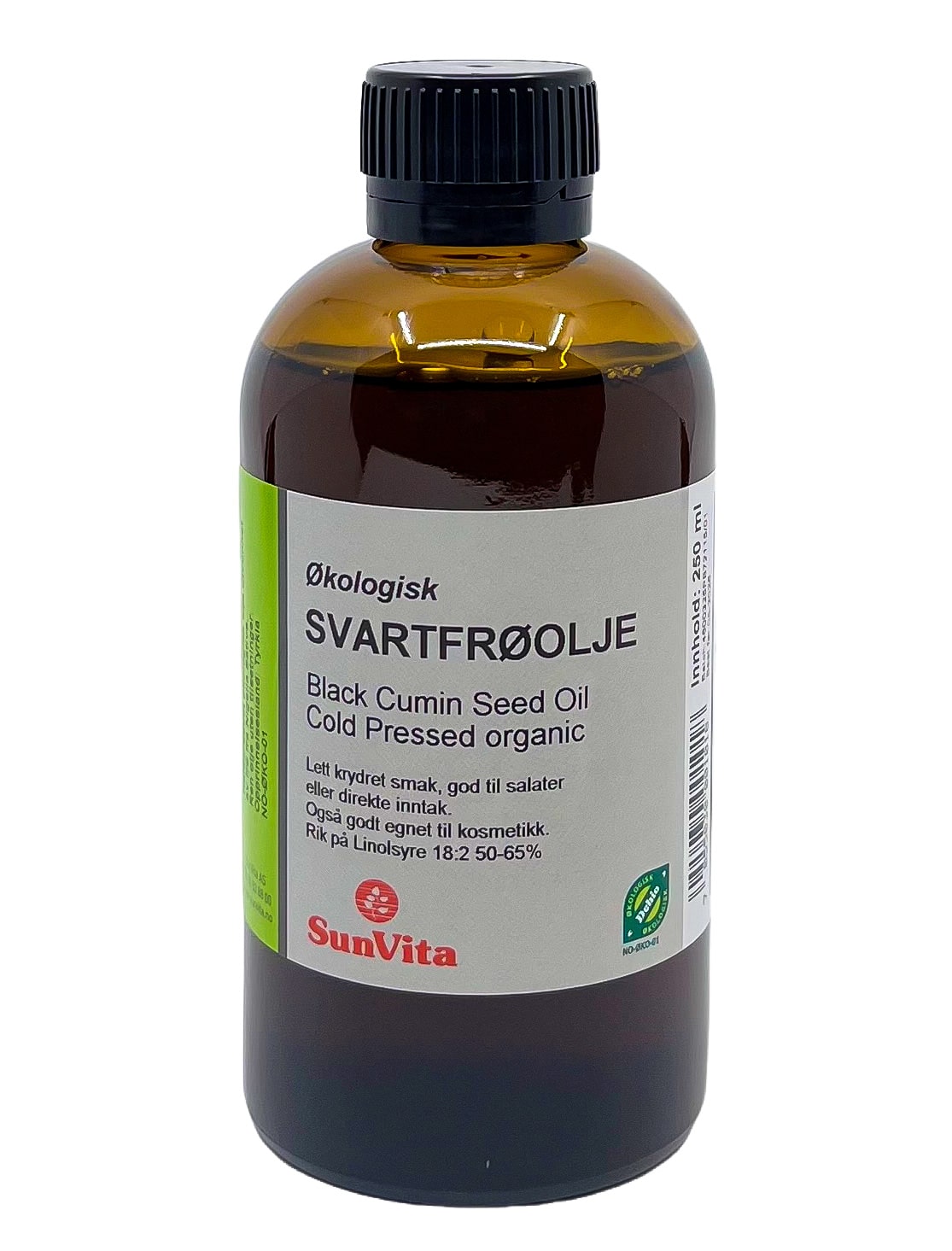 Svart frø olje er produsert fra frøet av Nigella sativa. Ved forsiktig kaldpressing og filtrering etterpå oppnås en klar, gyllen brunaktig olje. Farge, lukt og smak kan variere ut fra produksjonssted. Vi selger oljer fra Tyrkia og Egypt Svartfrøoljen inneholder en høy andel biologisk aktive, flerumettede fettsyrer, spesielt linolsyre som kan være gunstig for kolesterolet. Økologisk svartfrø olje kan nytes alene, eller den kan brukes i salater og andre kalde forretter. Oljen har ikke bare utmerkede egenskaper, men også en lett aromatisk lukt og smak. Kan også brukes til å smøre på huden da spesielt til uren hud. Gjennomsnittlige næringsverdier pr. 100 g Kalorier 3404 kJ / 828 kcal Fett 92 g av dette er mettede fettsyrer 15 g enumettede fettsyrer 23 g flerumettede fettsyrer 54 g her av linolsyre 51 g Karbohydrater 0 g Fibre 0 g Protein 0 g Salt 0 g